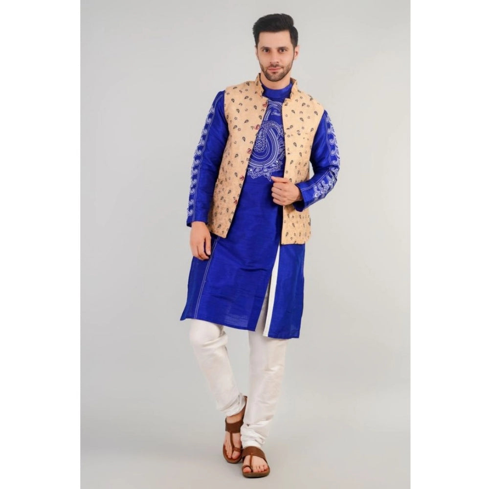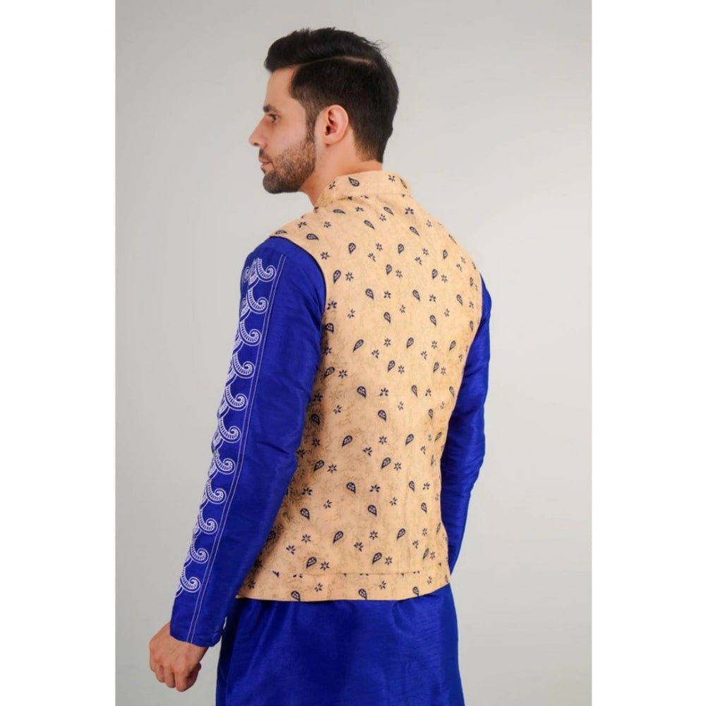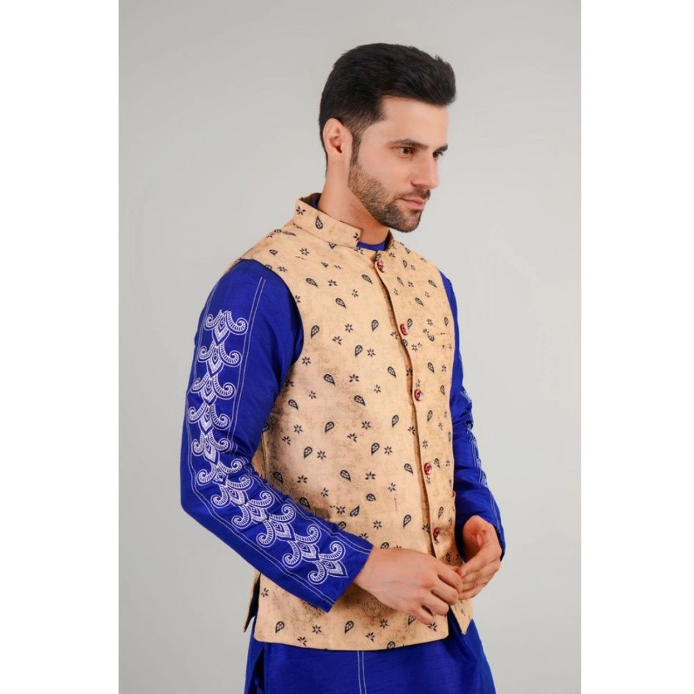 Mayawye Men's Jacquard Self-Design Sleeveless Mandarin Neck Waistcoat (Beige)
