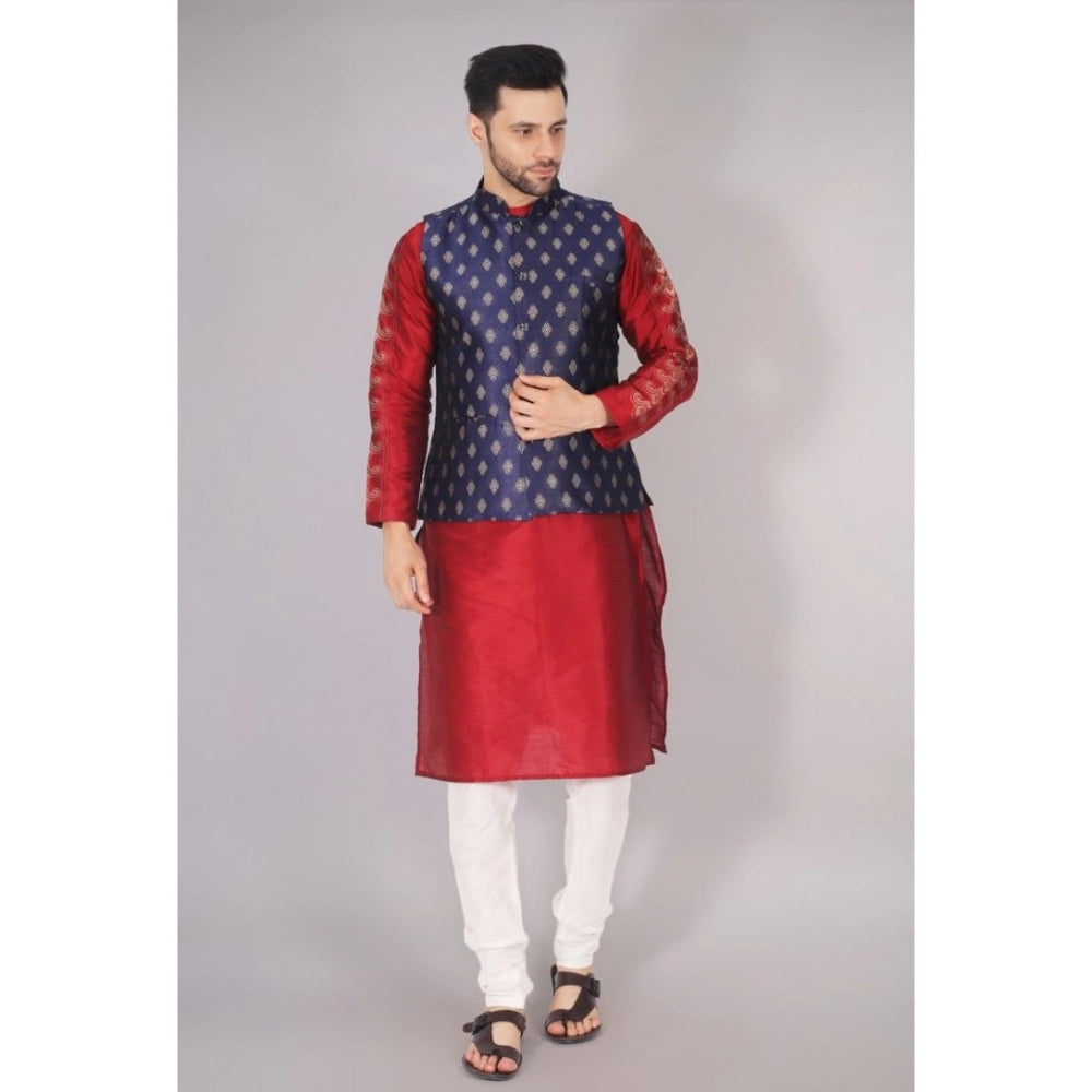 Mayawye Men's Jacquard Self-Design Sleeveless Mandarin Neck Waistcoat (NavyBlue-Gold)