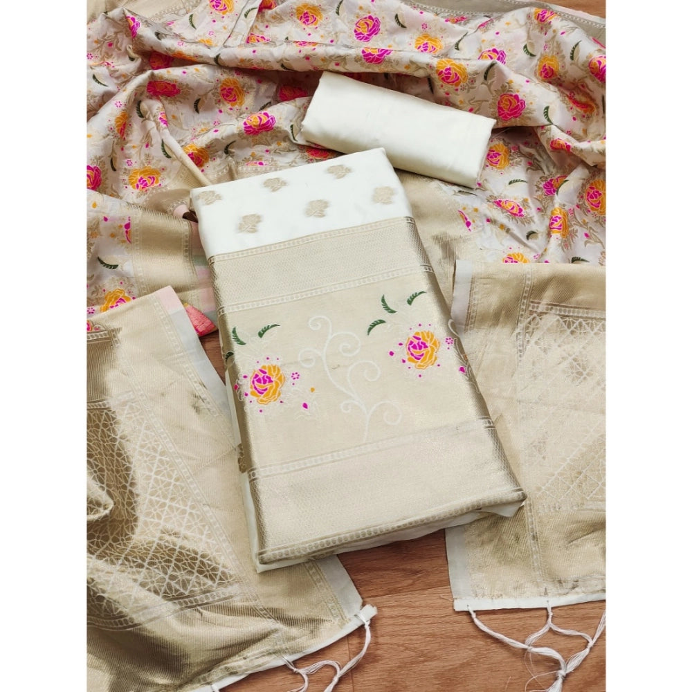 Mayawye Women's Banarasi Silk Printed Unstitched Salwar Suit Material With Dupatta (White, 3Mtrs)