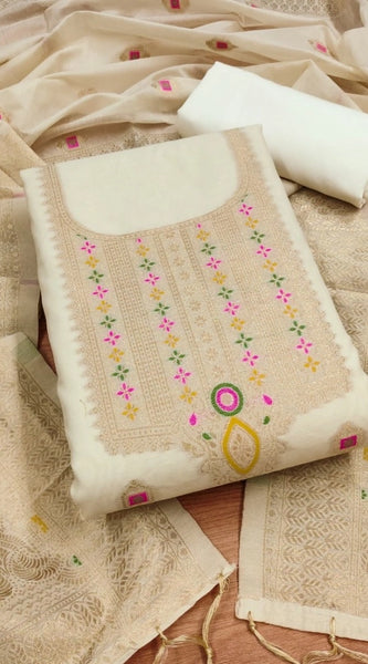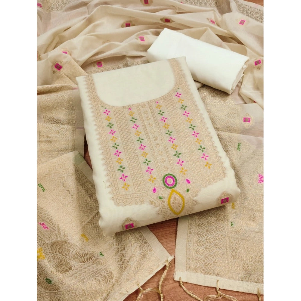 Mayawye Women's Banarasi Silk Printed Unstitched Salwar Suit Material With Dupatta (White, 3Mtrs)