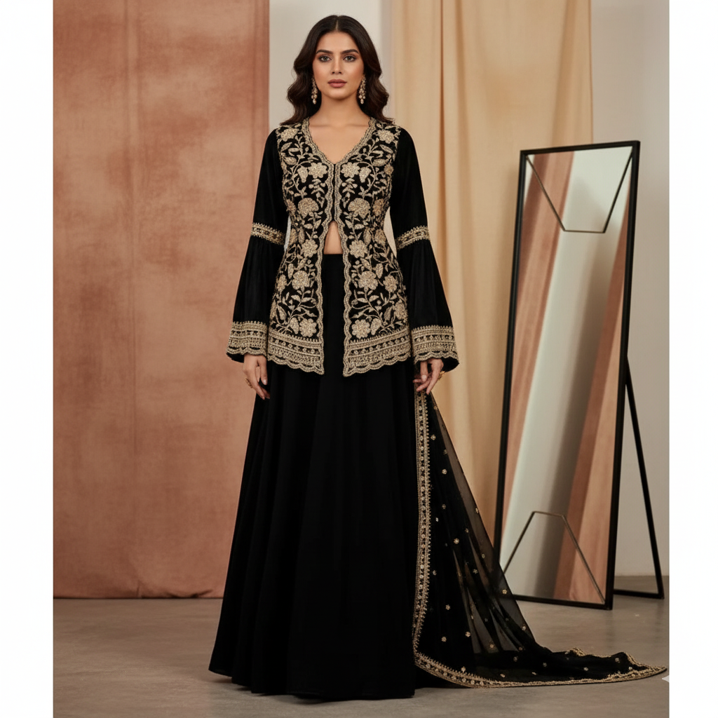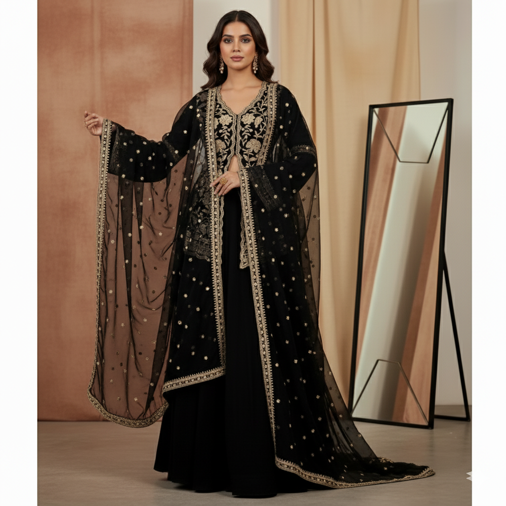 Mayawye Women's Georgette Embroidery 3-4th Sleeve V-Neck Kurti, Palazzo And Dupatta Set (Black)
