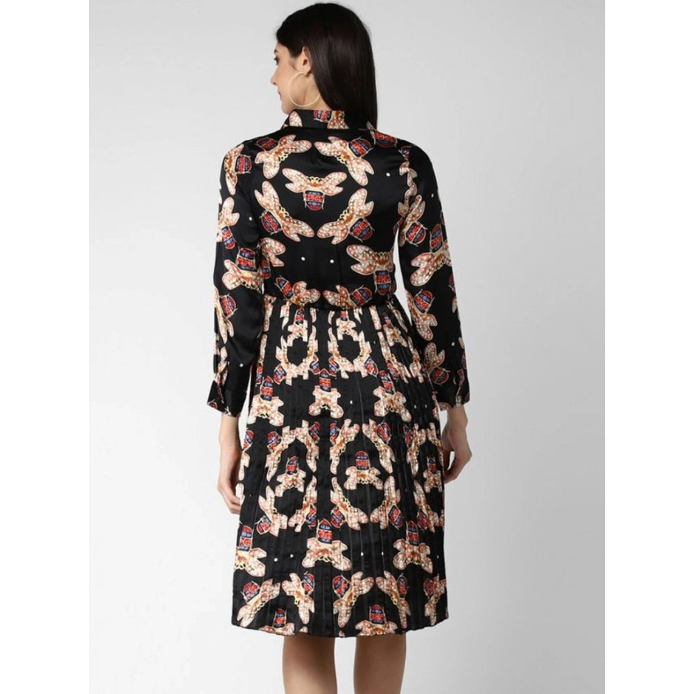 Mayawye Women's Polyester Pleated Collar Neck Long Sleeves Dress (Black)
