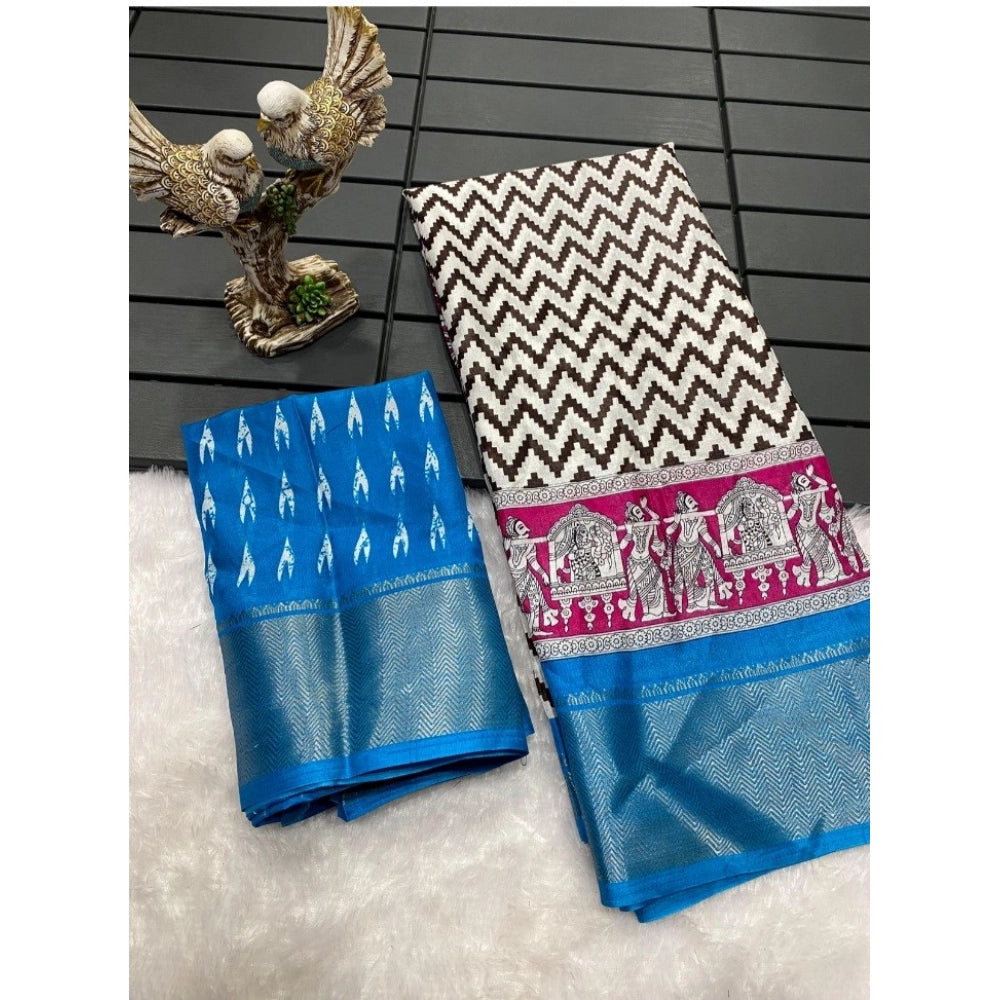 Mayawye Women's Soft Dola Cotton Kalamkari Printed Saree With Unstitched Blouse 5.5Mtr (Sky Blue)