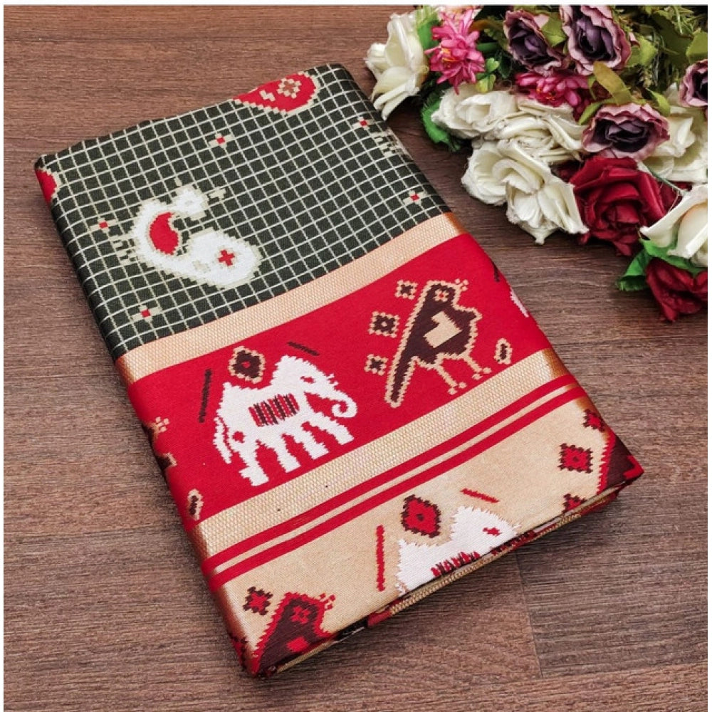 Mayawye Women's Soft Litchi Silk Jacquard Work Saree With Unstitched Blouse 5.5Mtr (Black-Red)