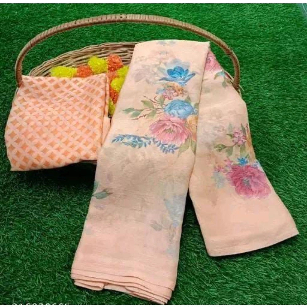 Mayawye Women's Viscose Rayon Printed Saree With Unstitched Blouse (Peach)